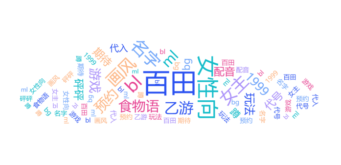 将《代号砰砰》小红书官方账号首曝PV下的评论区进行数据抓取并提取高频词制作词云图,可以很明显看到玩家关注的关键词集中在“百田”“女性向”“食物语”“乙游”“BL”这些有关项目背景的讨论上。此外,“配音”“玩法”“代入”“画风”“预约”等也受到高度关注。