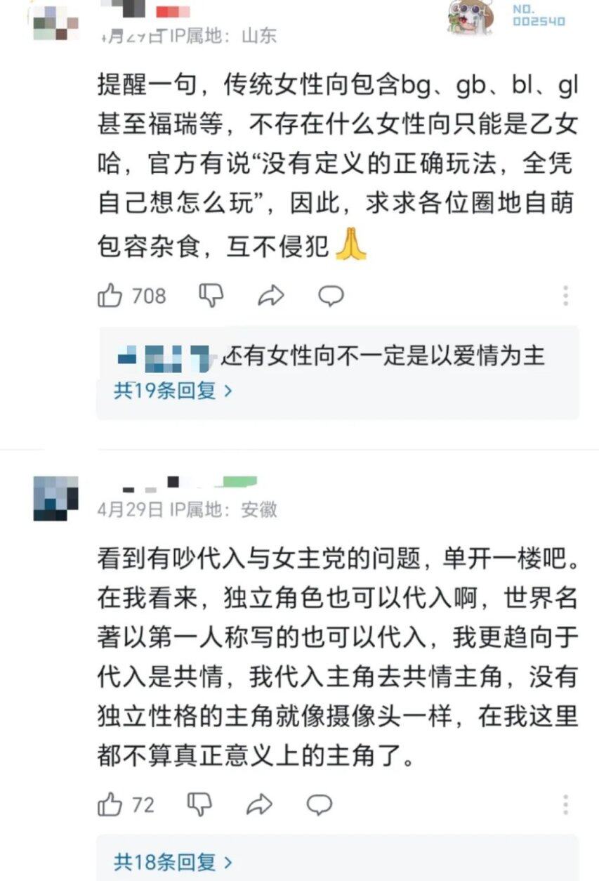 这种分歧的背后,是两种不同玩家群体对女性向游戏主角定位的不同理解:一边追求角色主体性与独特性的塑造,另一边则更看重代入感和情感共鸣。