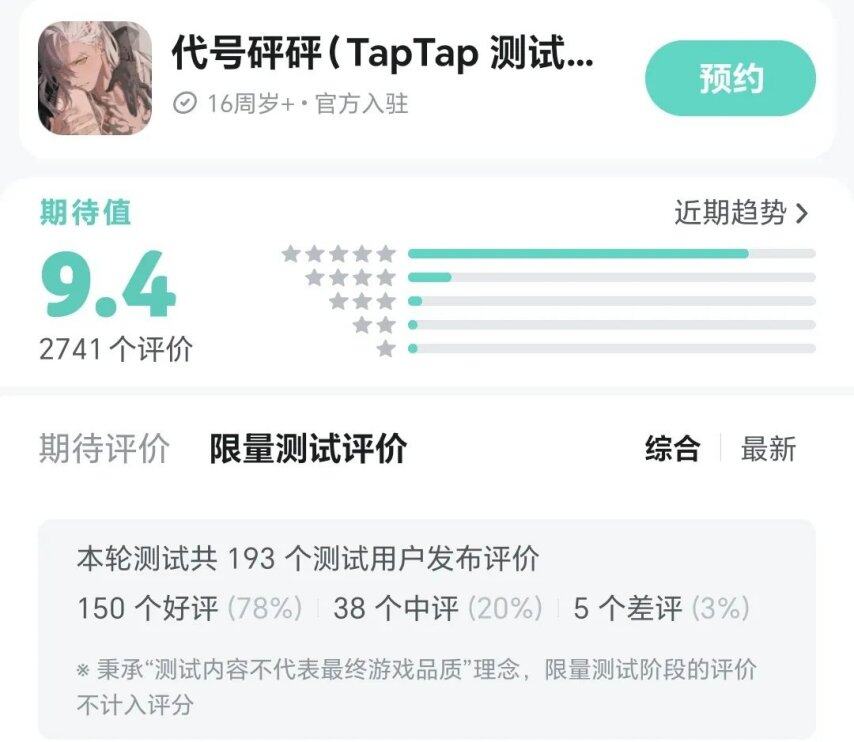 截至目前(5.30号),《代号砰砰》在TapTap已收集到193条测试玩家评价,其中150条好评(78%)、38条中评(20%)及5条差评(3%),整体评价不错。
