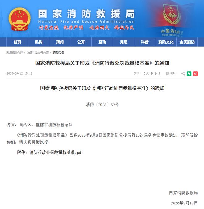 2025年9月10日,国家消防救援局官网发布《国家消防救援局关于印发消防行政处罚裁量权基准的通知》(消防(2025)39号),自2025年11月9日起施行。